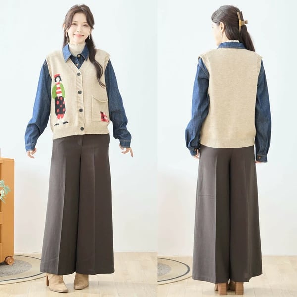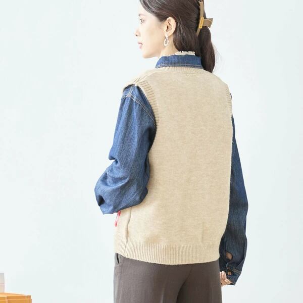 フロントにアートタッチのガールモチーフが描かれた、遊び心のあるニットベストです。