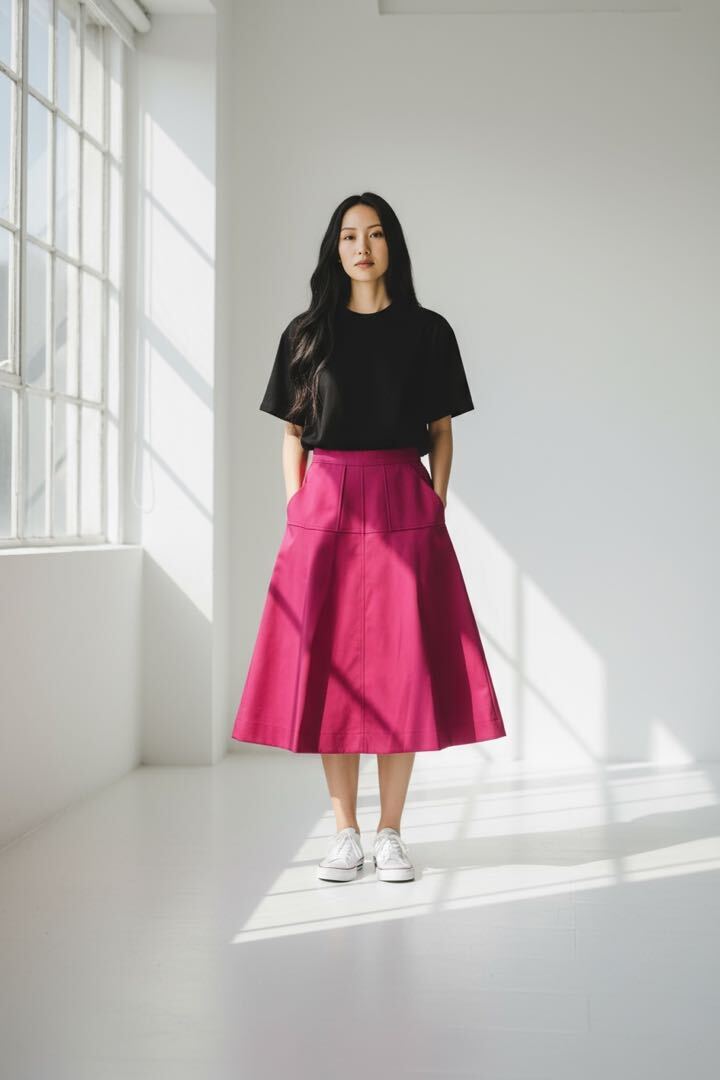 鮮やかなピンクカラーがコーディネートの主役になり、シンプルなトップスと合わせるだけで大人可愛い印象に仕上がります。
