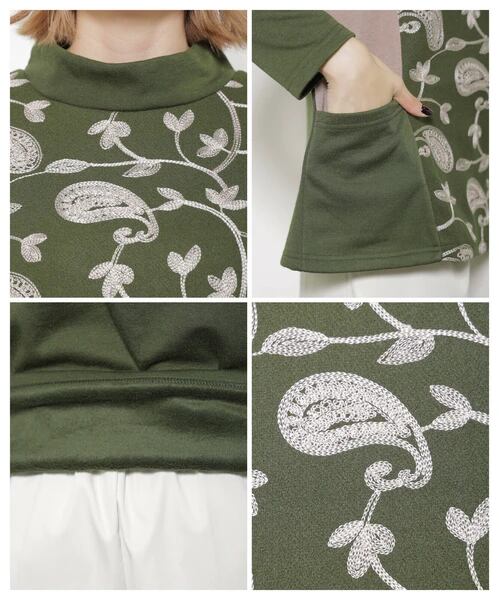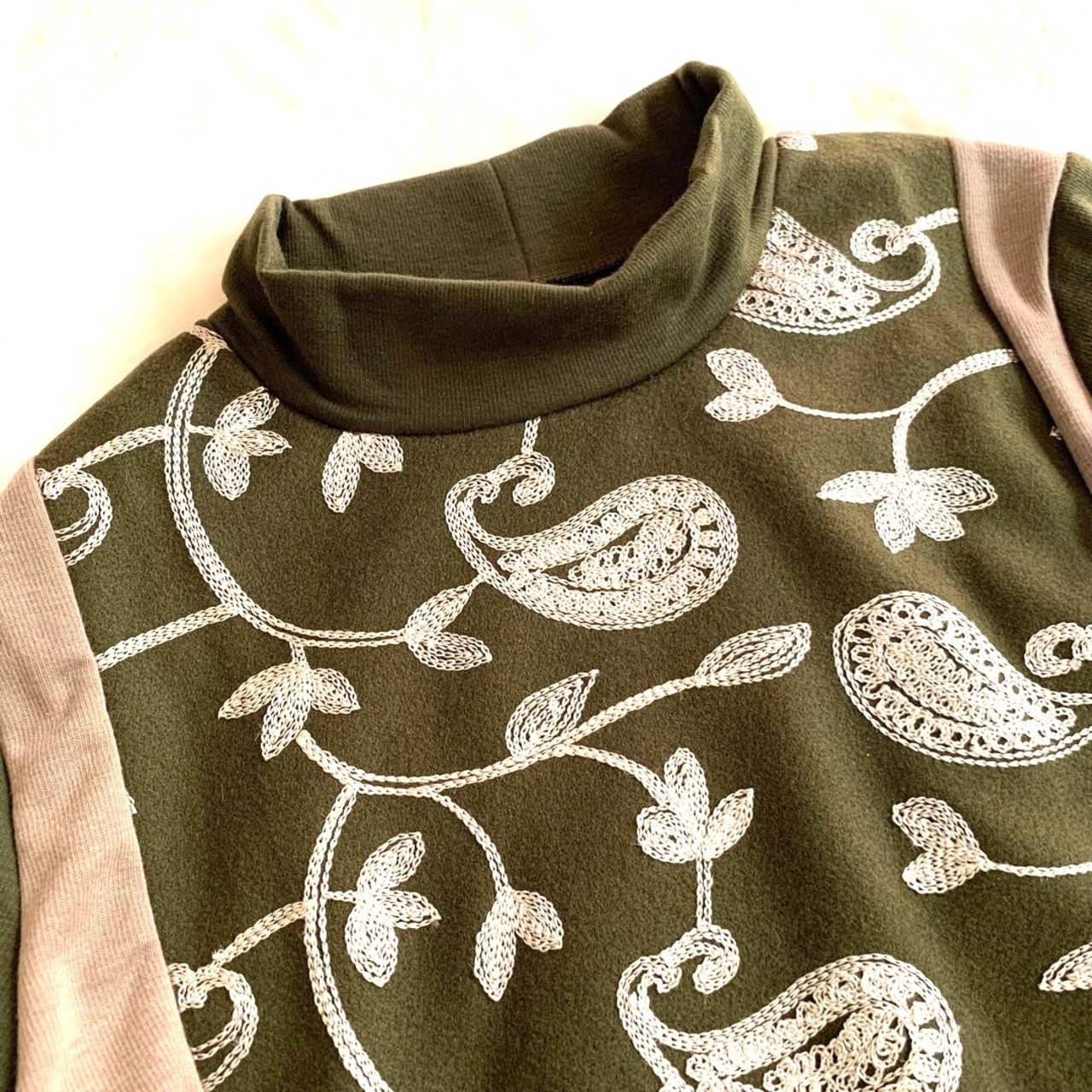 ペイズリー刺繍裏起毛トップス|カーキ M〜L