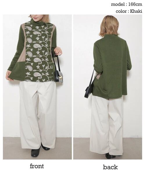 裏シャギー仕様で暖かく、ペイズリー柄刺繍が華やかなトップス。